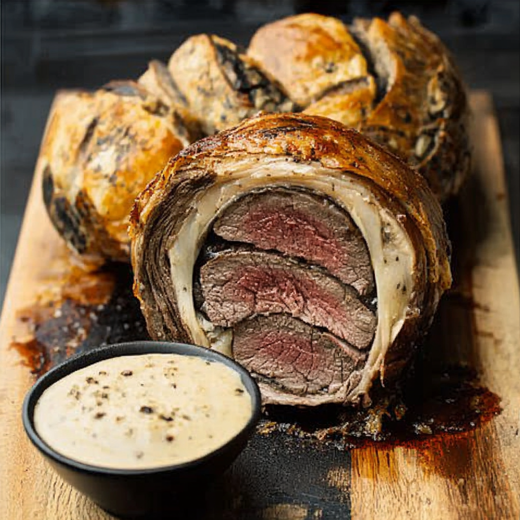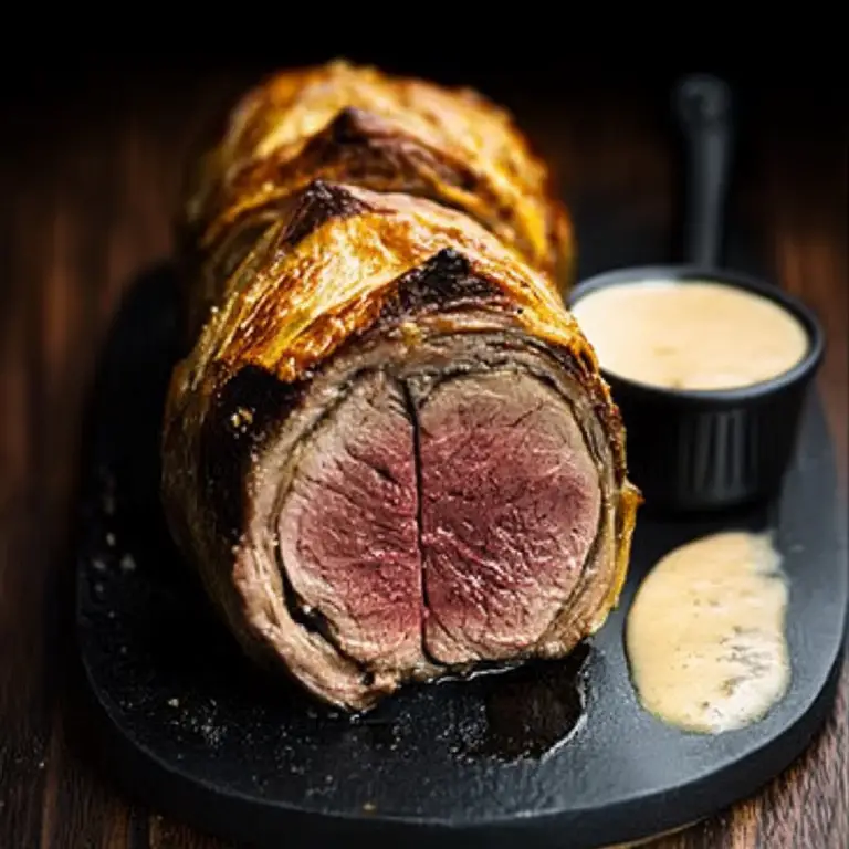 Gordon Ramsay’s Beef Wellington is a culinary masterpiece that transforms a simple meal into an extraordinary dining experience. This elegant dish features a succulent center-cut beef filet wrapped in savory mushroom duxelles and turkey slices, all encased in a flaky puff pastry. Ideal for special occasions or intimate dinners, its rich flavors and stunning presentation will surely impress your guests.