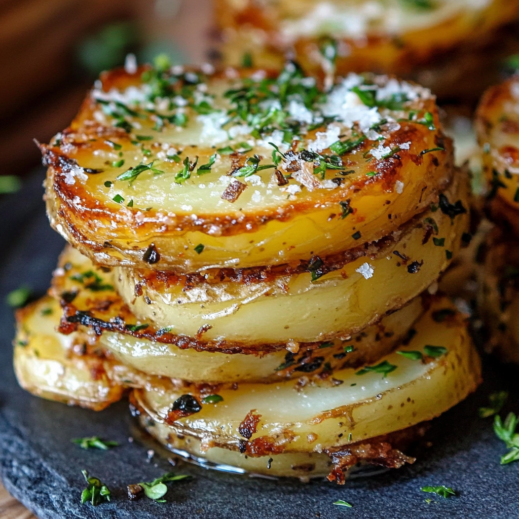 Remove from the oven and let cool slightly before serving. Garnish with extra fresh herbs if desired. Enjoy your Roasted Garlic Parmesan Potato Stacks as an impressive side dish!