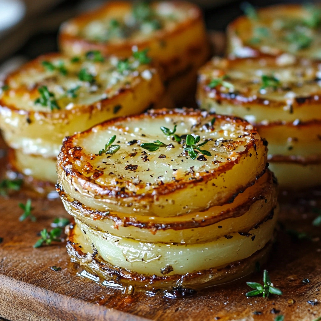 Elevate your dining experience with Roasted Garlic Parmesan Potato Stacks, a visually stunning and delicious side dish. This recipe features thinly sliced russet potatoes layered with aromatic roasted garlic and rich Parmesan cheese, resulting in a delightful combination of crispy edges and tender centers. Perfect for family dinners or special occasions, these potato stacks are sure to impress your guests with their elegant presentation and mouthwatering flavors.